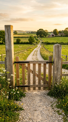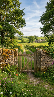 IMAGE PROMPT: Farmhouse gate entrance, beautifully constructed dry stone wall in warm grey and brown fieldstone extending across front with simple aged wooden swing gate opening in center, soft dappled afternoon light, wide shot camera angle, ancient and enduring mood, moss growing on top of stone wall, wildflowers growing at wall base, green countryside and blue sky beyond gate opening, color palette of warm grey and brown