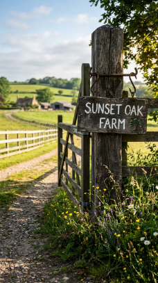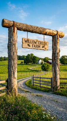 A wide painted board mounted between two gate posts bearing the farm name in hand-painted lettering is simple, proud and full of farmhouse personality.