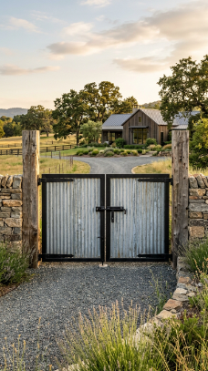 A combination of corrugated metal sheeting and wood frame gate creates a modern farmhouse entrance with strong industrial character.