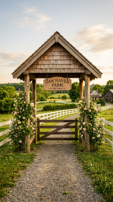 on four natural wood posts, farm name sign hanging from gable peak, warm golden afternoon light, wide shot camera angle, architectural and welcoming mood, gravel driveway entering beneath roof, white board fence extending each side, climbing roses on entrance posts, color palette of cedar shingle brown, warm natural wood posts, white fence and lush rose green, ultra-detailed photorealistic, Pinterest vertical 2:3 ratio, no people