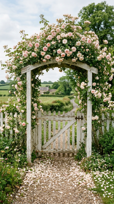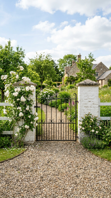A wooden or iron gate completely draped in blooming climbing roses is the single most romantic farmhouse entrance you will ever see.
