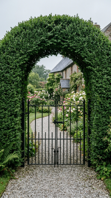 A neatly clipped boxwood hedge forming a natural living gateway around a simple wooden or iron gate creates the most refined formal farmhouse entrance.