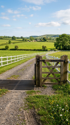 A traditional farmhouse cattle grid set into the driveway entrance beside a weathered wooden gate is authentically rural and impressively practical.
