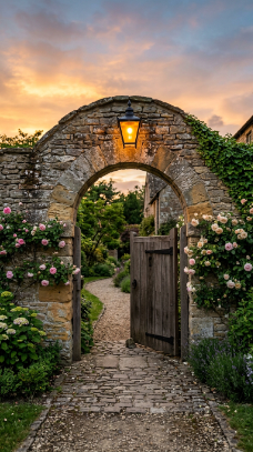 mood, wooden gate visible in arch opening, stone wall extending each side, climbing roses on arch base, golden dusk sky behind, color palette of warm fieldstone grey and honey, amber lantern light, dark iron and dusk sky gold and pink, ultra-detailed photorealistic, Pinterest vertical 2:3 ratio, no people