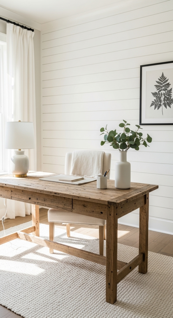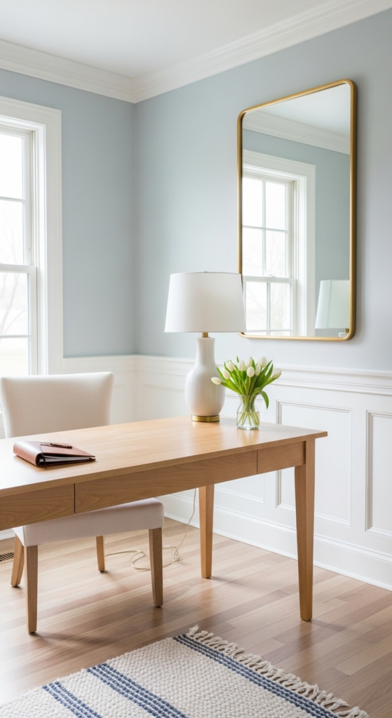 Styling Tips: Install classic beadboard or board-and-batten wainscoting in crisp white below a chair rail, and paint the upper wall in a soft complementary tone like pale blue-gray or warm cream. The contrast creates a beautiful backdrop for a light wood desk and simple accessories. Hang a large oval or rectangular mirror above the desk to bounce light and make the space feel larger.
