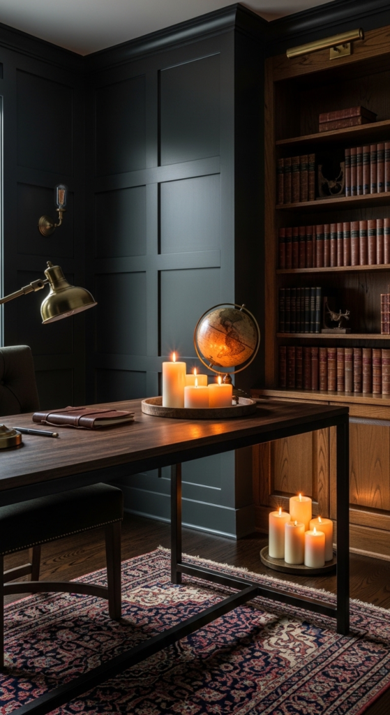 Deep charcoal walls, brass accents, and the flicker of candlelight turn a simple home office into a dramatic, deeply inviting retreat you’ll never want to leave.