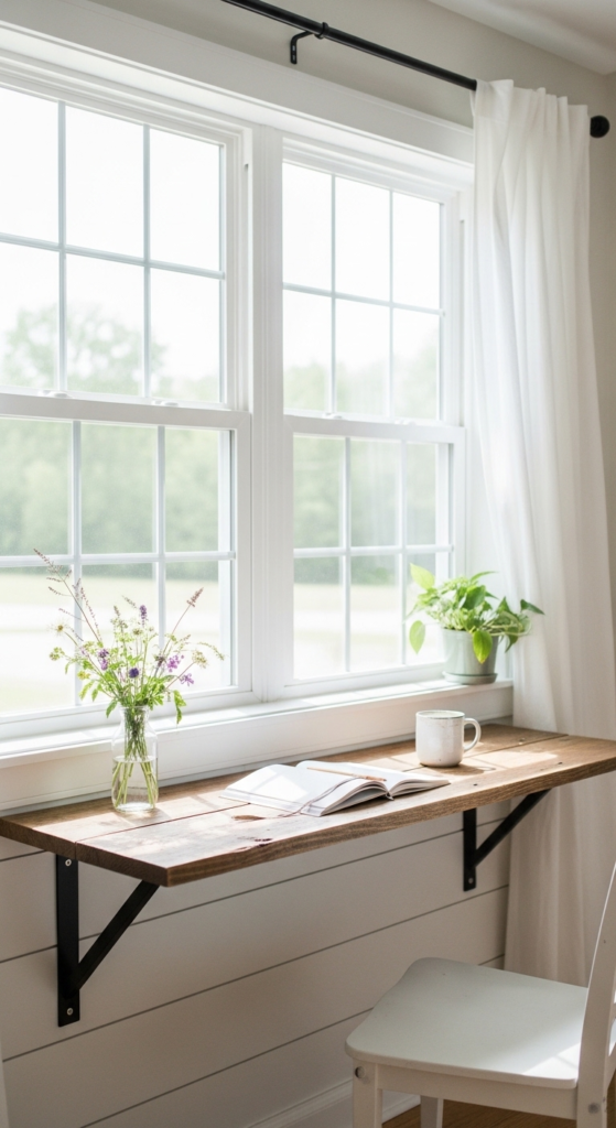 Styling Tips: Choose a floating reclaimed wood shelf or a narrow shaker-style desk and position it flush under a large double-hung window. Style it with a small glass vase of wildflowers, a linen-covered notebook, and a vintage ceramic mug. Keep the window treatment simple — white cotton sheers only — to maximize light.