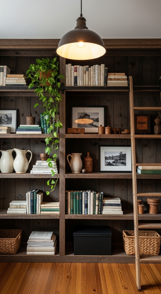 Styling Tips: Build or buy open shelves in reclaimed barn wood and style them with a mix of hardcover books, trailing pothos plants, vintage ceramic pitchers, and a few framed black-and-white family photos. Vary the heights of objects to create visual rhythm. Use a simple ladder to reach upper shelves — it adds both function and major rustic charm.