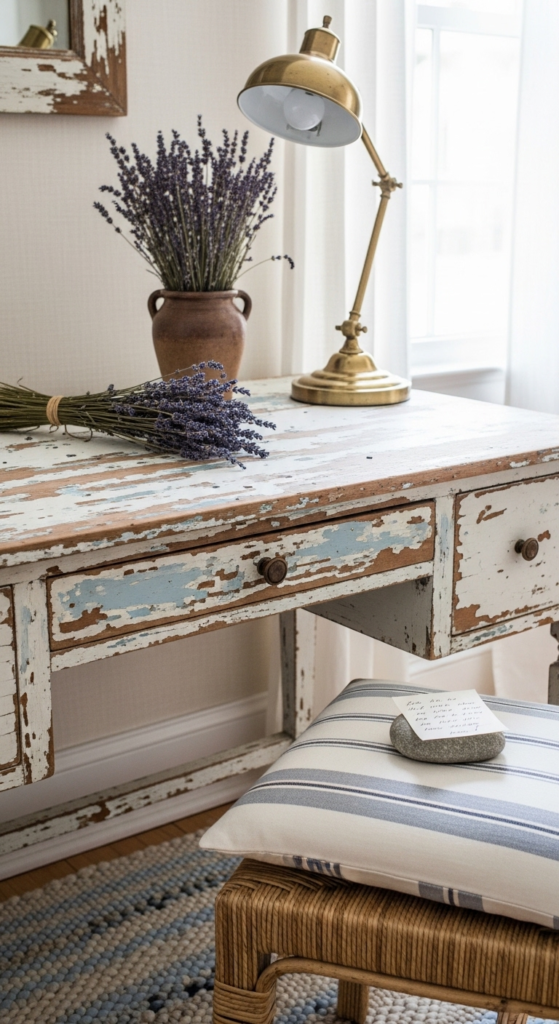 A beautifully chippy, distressed wooden desk carries decades of charm and tells a story — it’s the kind of piece that transforms a room from merely decorated to truly lived-in.
