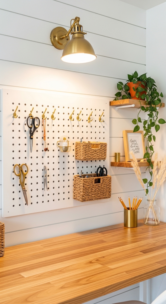 Styling Tips: Mount a large white-painted wooden pegboard above your desk and use a mix of brass hooks, small wooden shelves, and woven baskets to hold everything from scissors to sticky notes. Weave in a trailing plant, a small framed quote print, and a few dried floral stems for softness. Keep the pegboard items mostly neutral with one pop of color — terracotta or sage work beautifully.