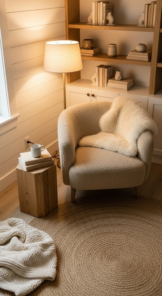 Styling Tips: Anchor the corner with a linen or bouclé armchair in warm cream or oatmeal. Add a small farmhouse-style side table in natural oak to hold your laptop, a ceramic mug, and a stack of books. Layer the floor with a chunky knit throw, a sheepskin throw blanket draped over the arm of the chair, and a large round jute rug. The floor lamp should be warm-toned and have a natural linen shade.