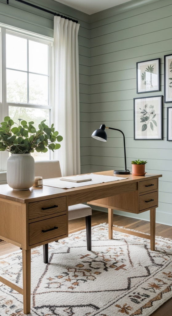 Styling Tips: Paint walls in muted sage green — Benjamin Moore’s “Saybrook Sage” or Farrow & Ball’s “Mizzle” are stunning choices. Pair with a raw oak desk, black iron accents, and layered neutral linens. Add fresh eucalyptus in a ribbed white vase, a black-framed gallery wall of botanical prints, and a warm-toned wool rug in cream and brown.