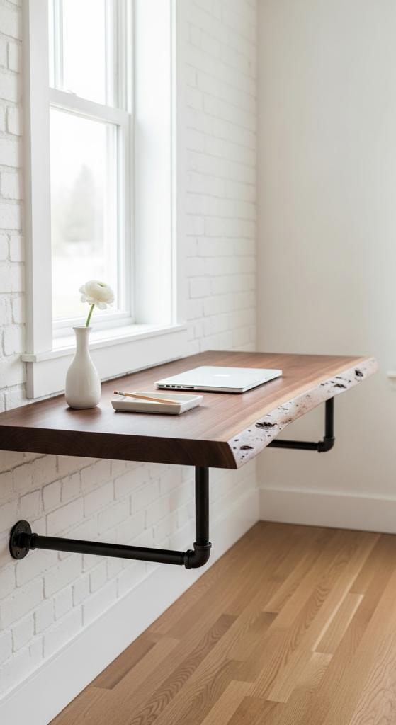 Styling Tips: Source a thick, live-edge or straight-cut reclaimed wood plank and mount it on iron pipe brackets or simple black floating shelf brackets. Keep the surface uncluttered — just a slim laptop, a single bud vase with a bloom, and a small ceramic tray for pens. Let the wood’s natural grain and imperfections be the star of the show.