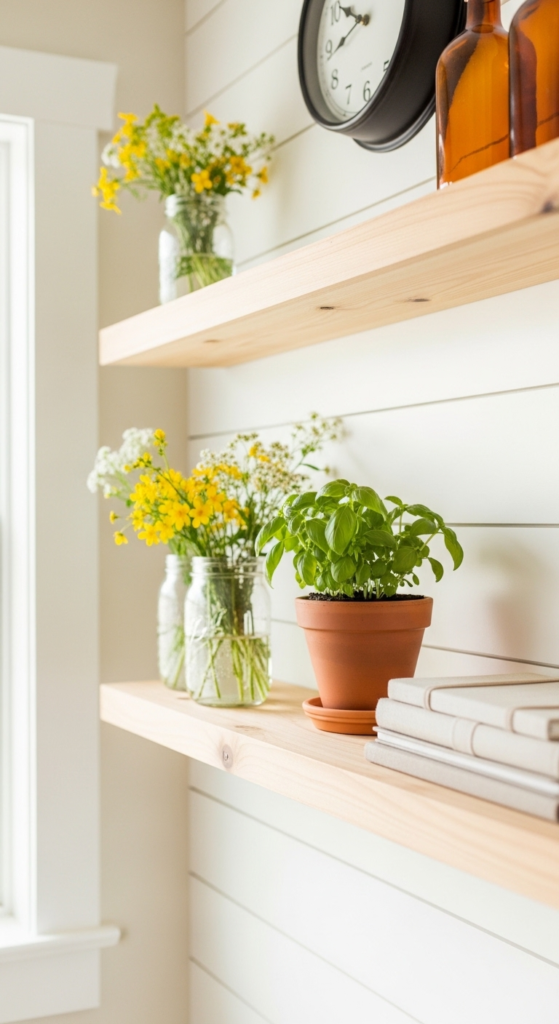 Styling Tips: Install two or three white-painted pine floating shelves directly onto a shiplap accent wall. Style with mason jars holding fresh or dried wildflowers, a small potted herb, a stack of linen-covered notebooks, and a vintage-inspired clock. Keep the arrangement loose and organic, not overly styled — the beauty is in its simplicity.
