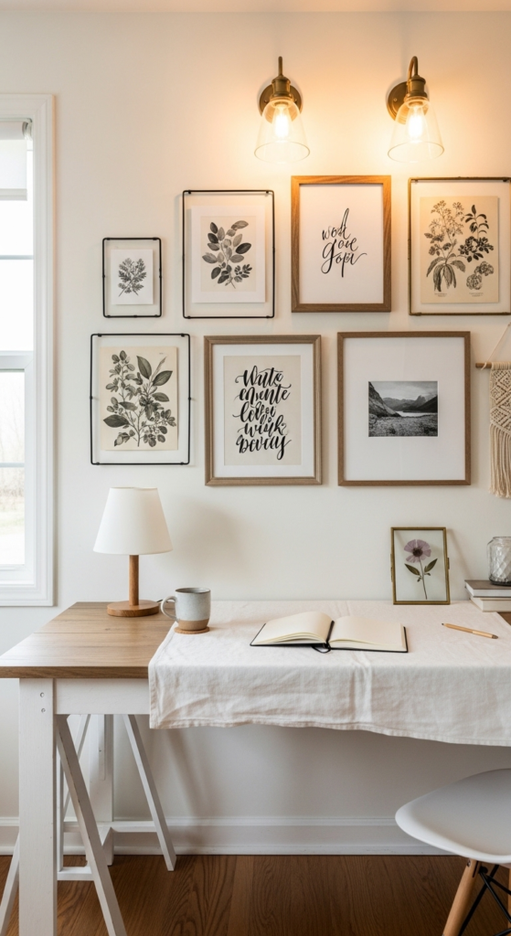 A carefully curated gallery wall above your desk — mixing vintage frames, botanical prints, handwritten quotes, and woven wall hangings — turns blank wall space into a deeply personal visual story.