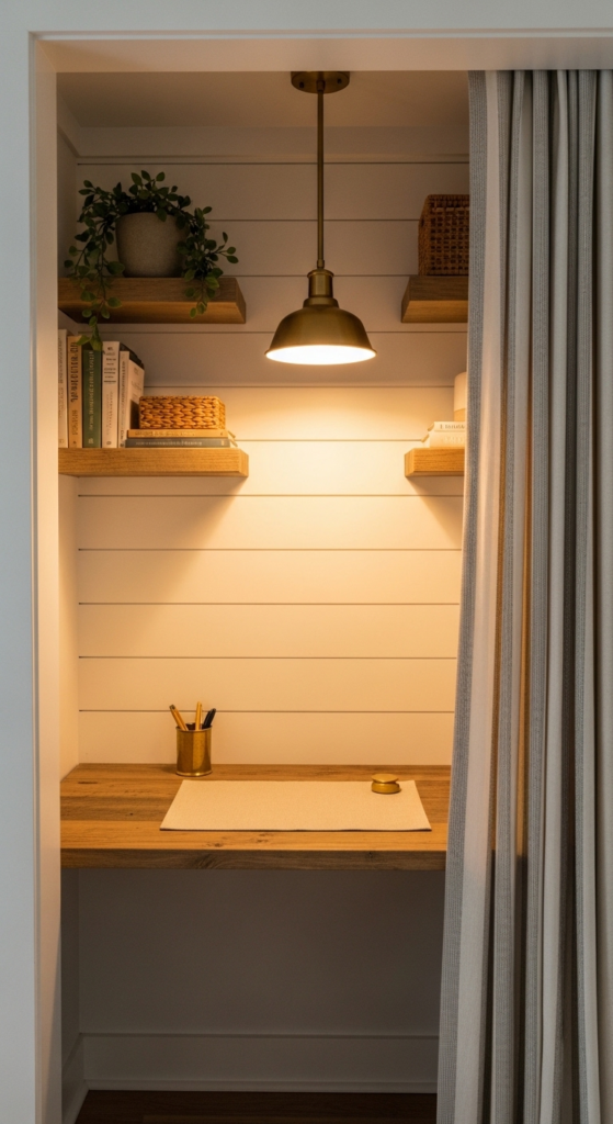Transforming a closet into a charming farmhouse office — complete with shiplap walls, built-in shelves, and a proper little desk — is the cleverest space-saving idea your home has been waiting for.