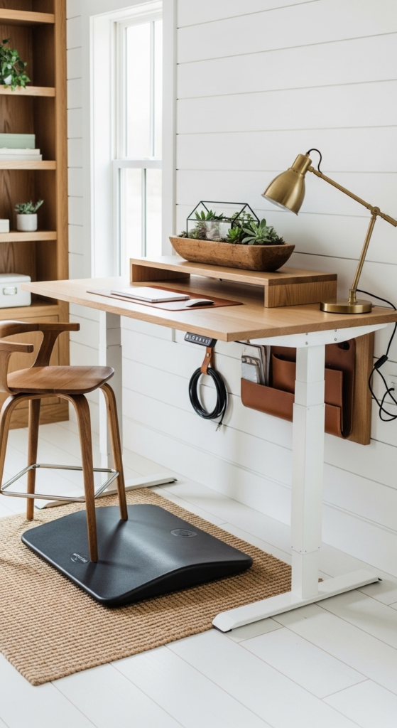 Styling Tips: Choose an adjustable or fixed standing desk in raw oak or reclaimed pine. Style with a large monitor riser in matching wood tone, a small succulent garden in a long wooden trough, a leather cable organizer, and a brass desk lamp. Place a supportive anti-fatigue mat with a natural fiber or neutral toned design beneath the desk. Add a bentwood bar stool for sitting breaks.