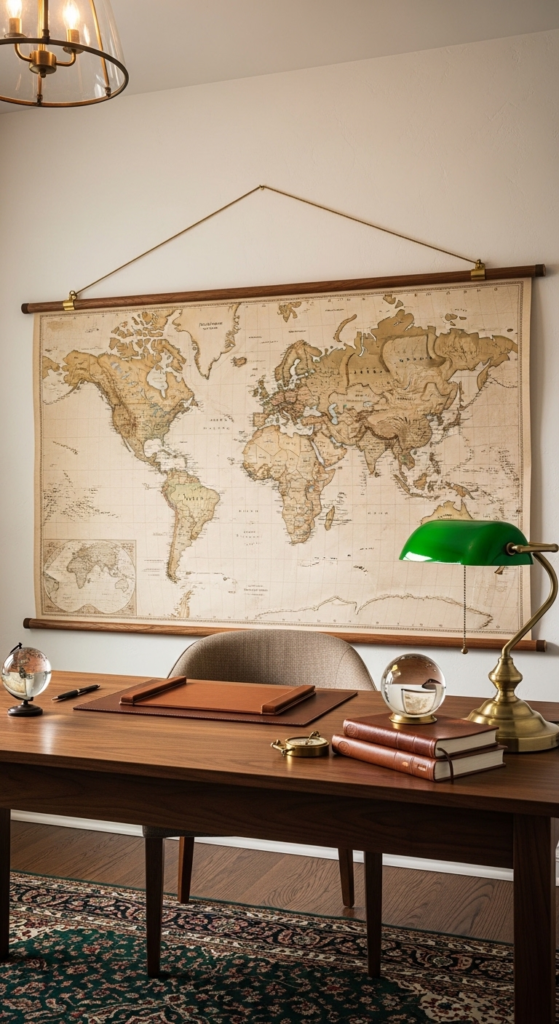 Styling Tips: Source a large printed vintage-style world map or an actual antique map and have it framed simply in natural wood or hung unframed with brass clips. Pair with a dark stained wood desk, a green banker’s lamp, a leather desk blotter, and a glass globe paperweight. Stack a few leather-bound travel journals and add a small brass compass as a decorative accent.