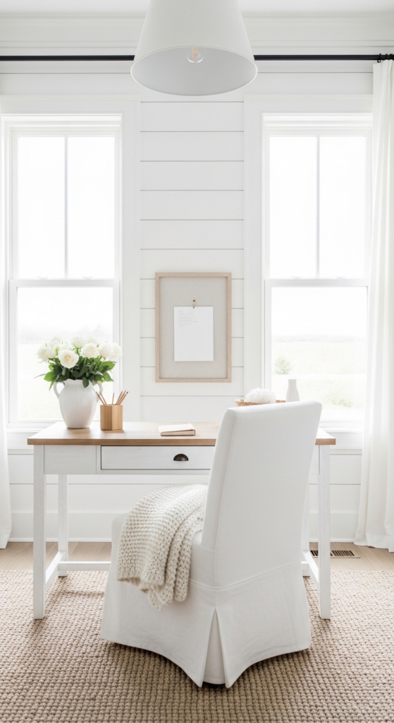 Styling Tips: The secret to an all-white office is texture. Layer in a chunky knit throw on a white upholstered chair, a woven jute rug, a ceramic vase with white garden roses, and a linen pinboard. Use varying whites — warm white, cool white, and ivory — so the room feels rich rather than flat. Add a single natural wood element: a pencil cup, a tray, or a small wood candle holder to ground the space.