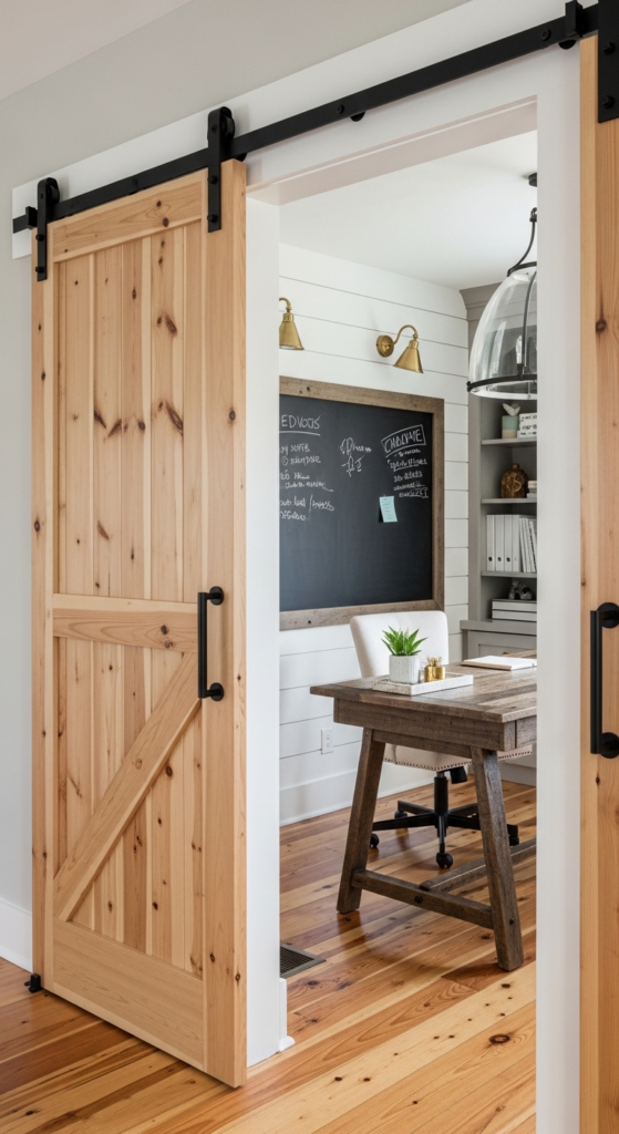 A sliding barn door on a farmhouse home office isn’t just a style statement — it’s also one of the smartest solutions for saving space and creating a defined work zone in an open-plan home.