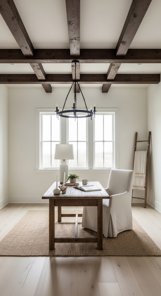 Styling Tips: If you’re lucky enough to have exposed beams, let them be the hero. Keep walls light and simple — white plaster or soft cream — so the beams read clearly. Hang a simple black wrought iron chandelier or pendant from the beam for lighting. Keep the desk and furniture grounded and low to visually balance the height. Drape a soft linen throw over a nearby ladder for texture and warmth.