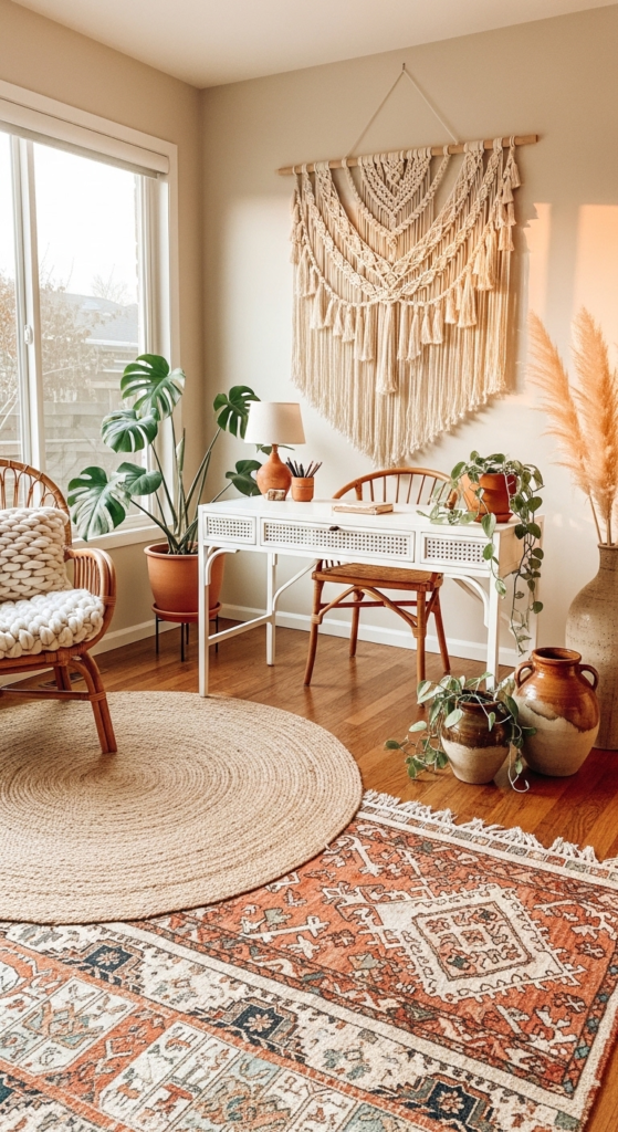 Styling Tips: Hang a large handmade macramé wall piece as the focal point above the desk. Layer two or three rugs — start with a large jute base and layer a smaller vintage-style kilim or Moroccan rug on top. Bring in a rattan chair, a tall monstera plant, and a collection of mismatched ceramic pots in earthy tones. Keep the desk relatively simple so the textile elements carry the visual weight.