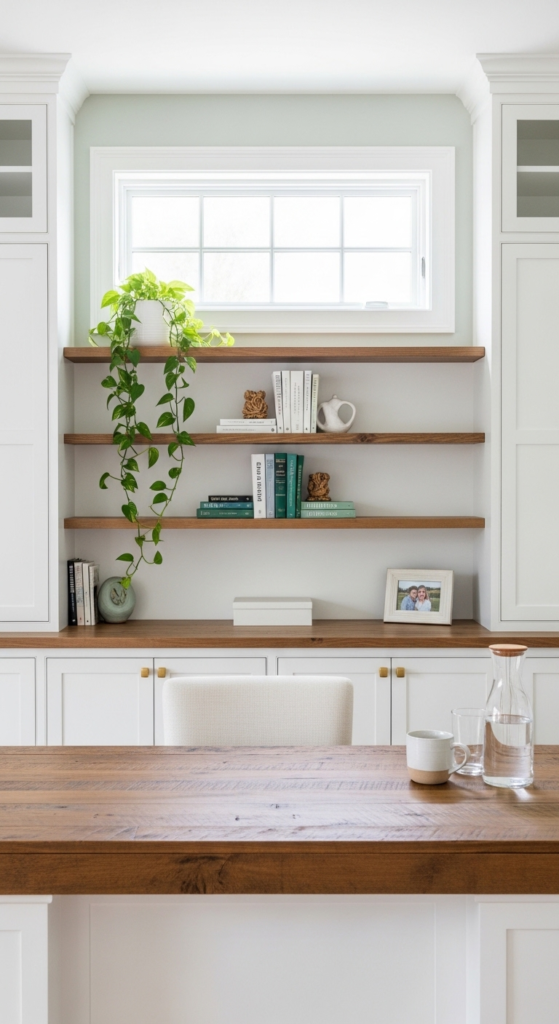 Styling Tips: Design built-ins with a mix of open shelving at eye level for curated display, and closed cabinetry with shaker-style doors below and above for hidden storage. Use unlacquered brass or matte black hardware consistently. Style open shelves with a mix of books, plants, ceramic objects, and one personal framed photo. Keep the desk surface itself clear and functional.