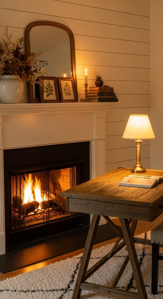 Styling Tips: Frame the fireplace with a simple white painted wood mantel in classic farmhouse style. Style the mantel with a mix of heights: a tall dried floral arrangement in a wide-mouth vase, a few small framed prints, a stack of books, and a single taper candle in a brass holder. Place the desk at an angle facing the fireplace so you can see both the screen and the flames.
