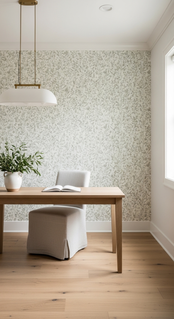Styling Tips: Choose a botanical or soft geometric wallpaper in earthy, muted tones — think cream and sage botanicals, dusty blue stripes, or warm taupe grasscloth. Apply it to the wall directly behind the desk for maximum impact. Keep the remaining three walls in a coordinating plain paint tone pulled from the wallpaper’s palette. Pair with simple, unadorned wood furniture and a single statement pendant light.