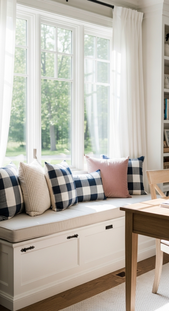 Styling Tips: Build a window seat with a hinged lid for storage below, upholstered in a durable cream or stripe linen fabric. Stack it with an assortment of throw pillows in complementary farmhouse textures: a cream waffle-knit pillow, a small buffalo check cushion, and a velvet lumbar in dusty blush. Place the desk perpendicular to the window seat so natural light falls across both spaces.