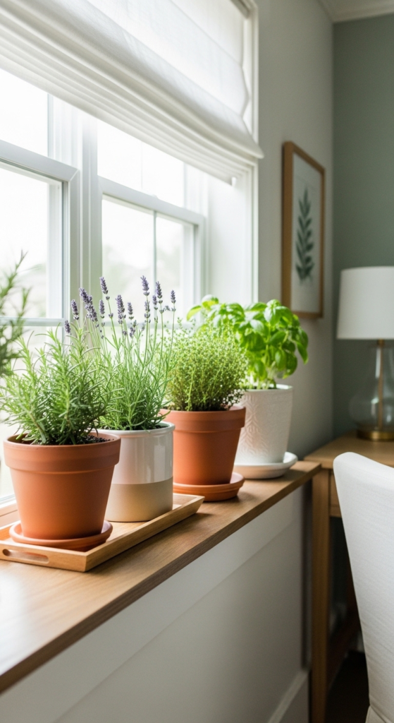 Styling Tips: Line your office windowsill with a mix of terracotta and white ceramic pots planted with fragrant herbs: rosemary, lavender, lemon thyme, and basil. Use a simple wooden tray to keep them contained and prevent water rings. The greenery softens the window and scents the air naturally. Pair with sheer white Roman shades above for clean lines that let light in without blocking the view.