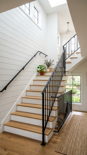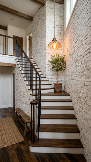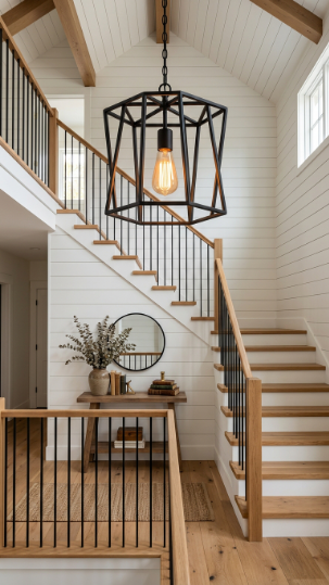Farmhouse staircases are all about mixing texture, warmth, and that effortless “collected over time” feeling. Think shiplap walls, wrought iron balusters, natural wood treads, and just the right touch of greenery or lanterns along the way.