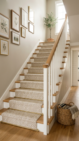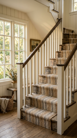 A soft woven runner over natural wood treads adds warmth, texture, and elegant comfort.