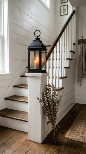 A lantern on the newel post with a shiplap wall — instant farmhouse atmosphere.