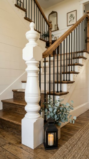 An oversized, chunky turned wood newel post makes a grand farmhouse first impression.