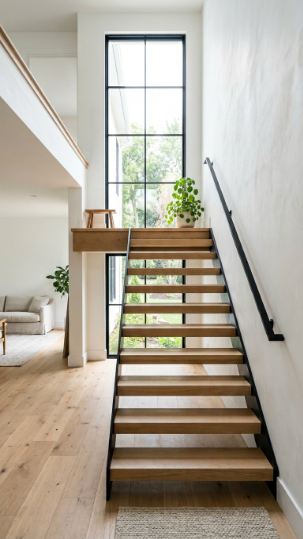Floating wood steps with open risers create a light, modern farmhouse statement.
