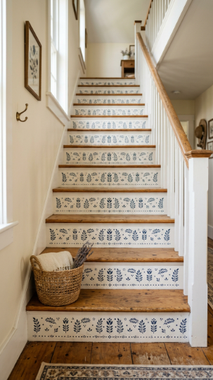 Hand-painted stencil patterns on each riser add folk art charm and serious personality.