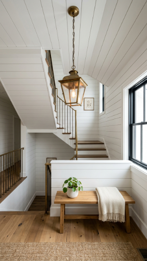 Crisp white shiplap lining the staircase wall — clean, classic, and endlessly farmhouse.