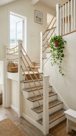 Nautical jute rope threaded through posts creates a coastal farmhouse railing with soul.