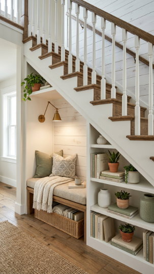 The space under the stairs becomes a cozy styled nook with built-in shelving or seating.