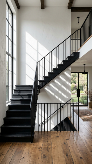 An all-black staircase — treads, risers, and railing — makes a bold luxury farmhouse statement.
