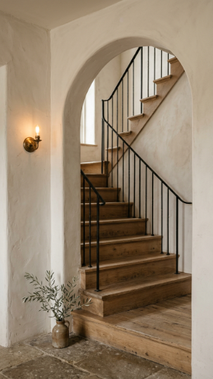 A soft plaster arch framing the staircase entry gives a European farmhouse wow factor.