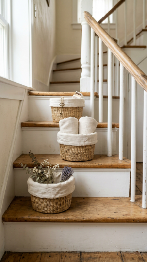 Small woven baskets or linen bins on the stairs make practical storage look incredibly charming.