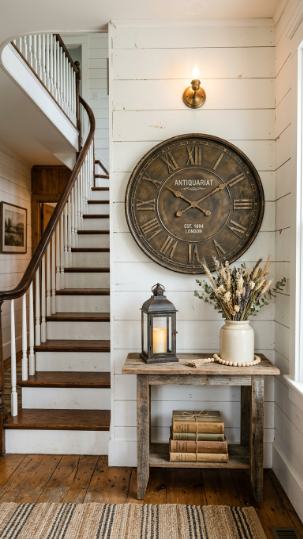 An oversized vintage clock or wooden sign on the landing wall makes a big farmhouse impression.