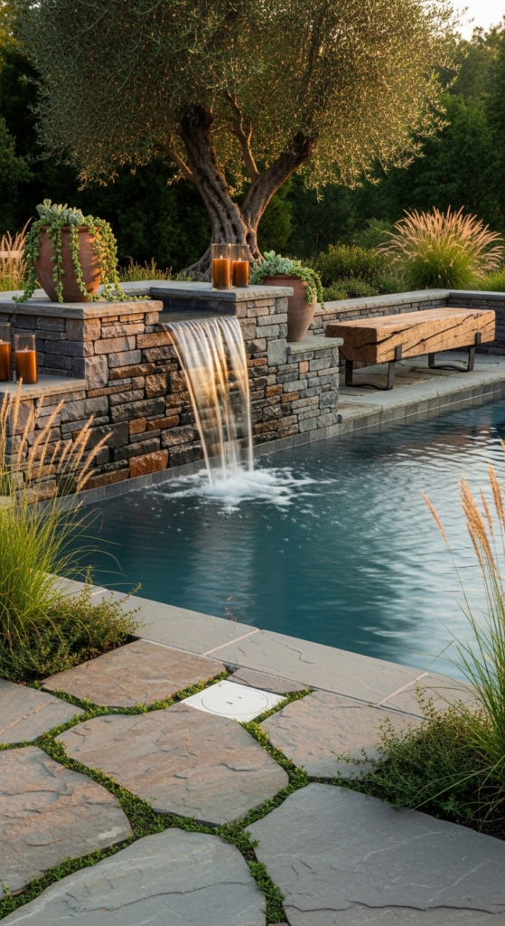 Tall ornamental grasses sway at the edges, and a single gnarled olive tree anchors one corner of the yard. A chunky wooden bench with iron legs sits near the waterfall wall, perfect for those who want to watch the water without getting in. This design is ideal for nature lovers and those who want their pool area to feel like it was carved from the earth. Use terracotta pot clusters and bronze outdoor candles to amplify the warmth.