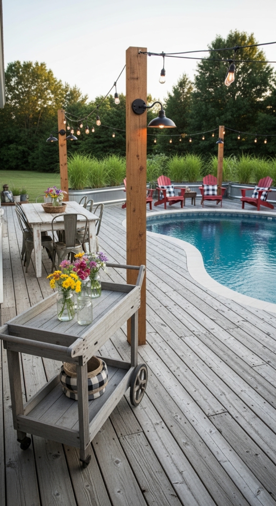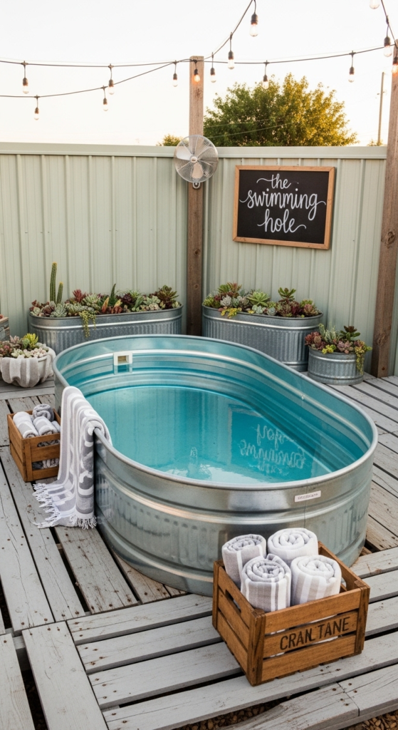 Around the tank, the deck is accessorized with intention: a crate of rolled linen towels, a small succulent garden in matching galvanized planters, and a vintage-style outdoor fan clipped to a nearby post. A chalkboard sign reads “the swimming hole” in chalky script. Cafe lights overhead create a festive backyard atmosphere at night. This design proves that farmhouse style isn’t about budget — it’s about intention and charm. Perfect for small backyards, rentals, or anyone wanting a seasonal pool solution with massive visual impact.