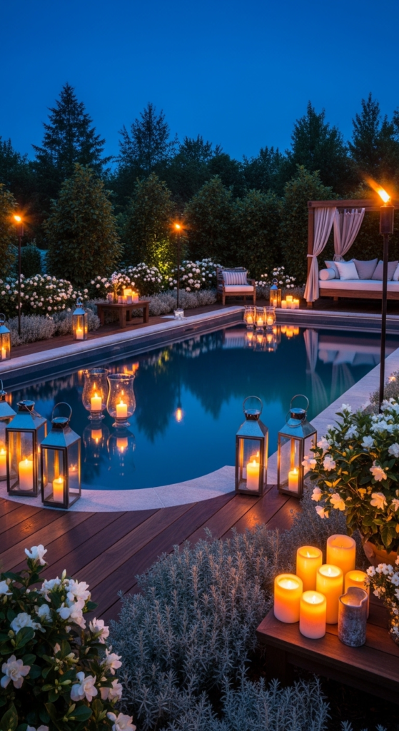There is a particular kind of magic that happens at a farmhouse pool after the sun goes down, and this design is built entirely around that twilight hour. Every element is chosen for how it looks by lantern and candlelight: a ring of large galvanized lanterns with pillar candles around the pool coping, hurricane vases with floating candles in the water’s surface, and tall iron torches at the four corners of the pool deck.