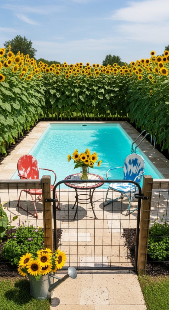 In the American farmhouse tradition, what surrounds a pool can be just as beautiful as the pool itself — and this idea replaces the typical pool fence with something that takes your breath away. Tall sunflowers, planted in a dense double row just behind a simple black wire fence, form a living golden wall around the pool perimeter. By midsummer, they tower six to eight feet high, blocking neighbors’ views while filling the air with that unmistakable sweet pollen scent.