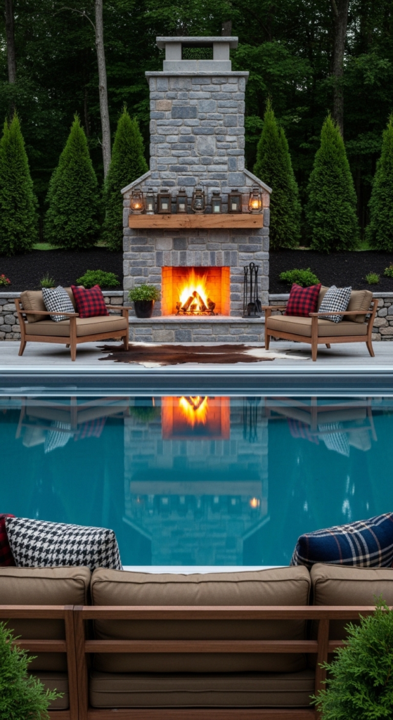When the summer evening air starts to cool and everyone wants to linger just a little longer, a farmhouse outdoor fireplace at one end of the pool deck becomes the magnetic center of the entire yard. This design positions a tall, freestanding fieldstone fireplace at the far end of the pool, its warm glow reflected in the water. The firebox is deep and open, and a thick cedar mantel sits above it, holding a row of mismatched antique lanterns.