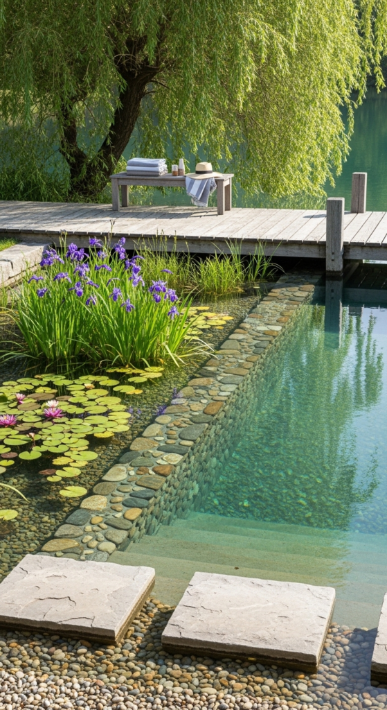 The pool is surrounded by smooth river pebbles and large flat stepping stones, and a weathered wooden dock extends a few feet over the swimming area. Weeping willows at the far end trail their fingertips along the water’s surface. A simple wooden bench under one willow holds a stack of linen towels and a wide-brimmed straw hat. The overall atmosphere is one of a discovered spring-fed pond rather than a constructed pool — wild, cooling, and entirely restorative. Perfect for environmental advocates, off-grid homesteads, and those who dream of a swimming hole instead of a pool.